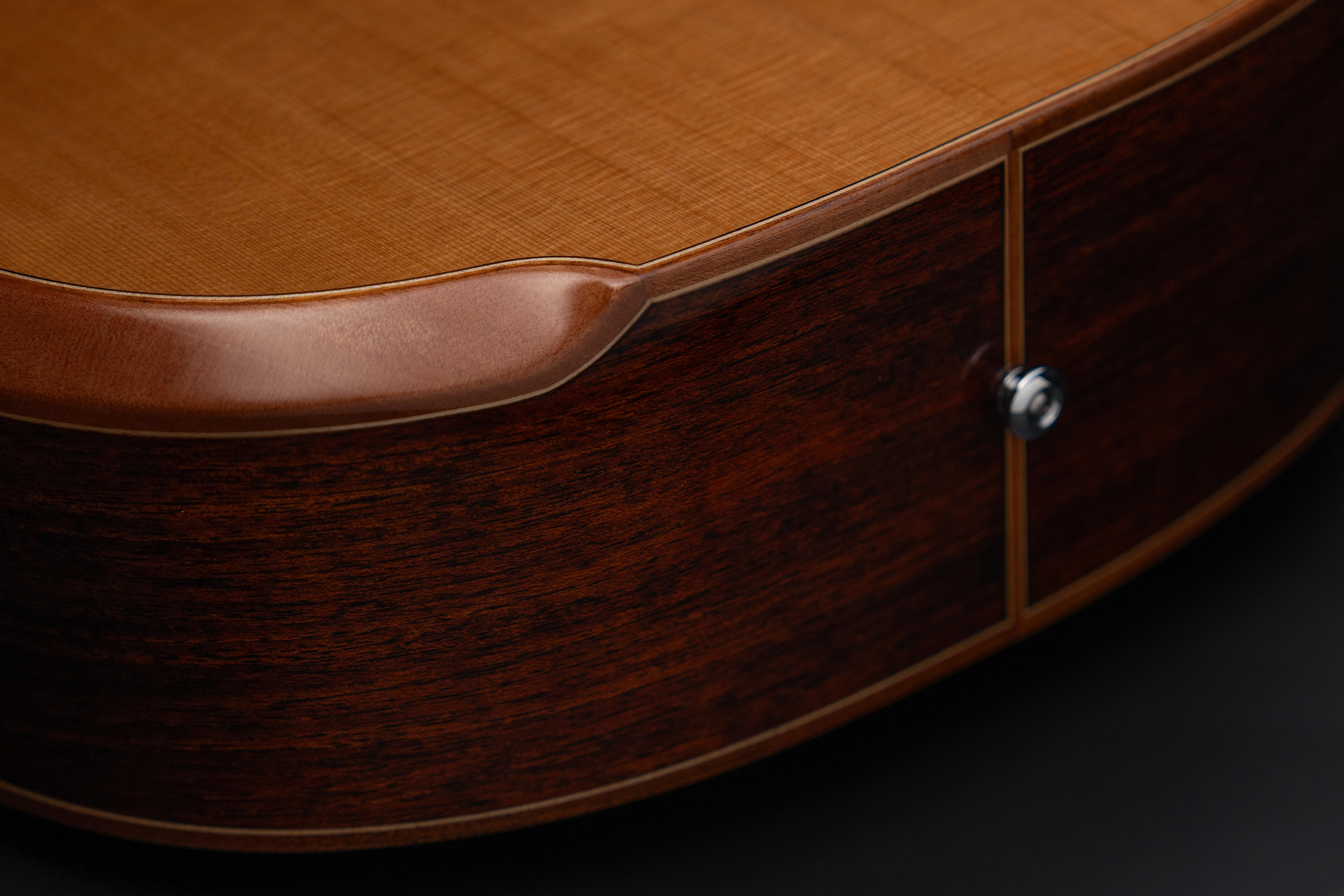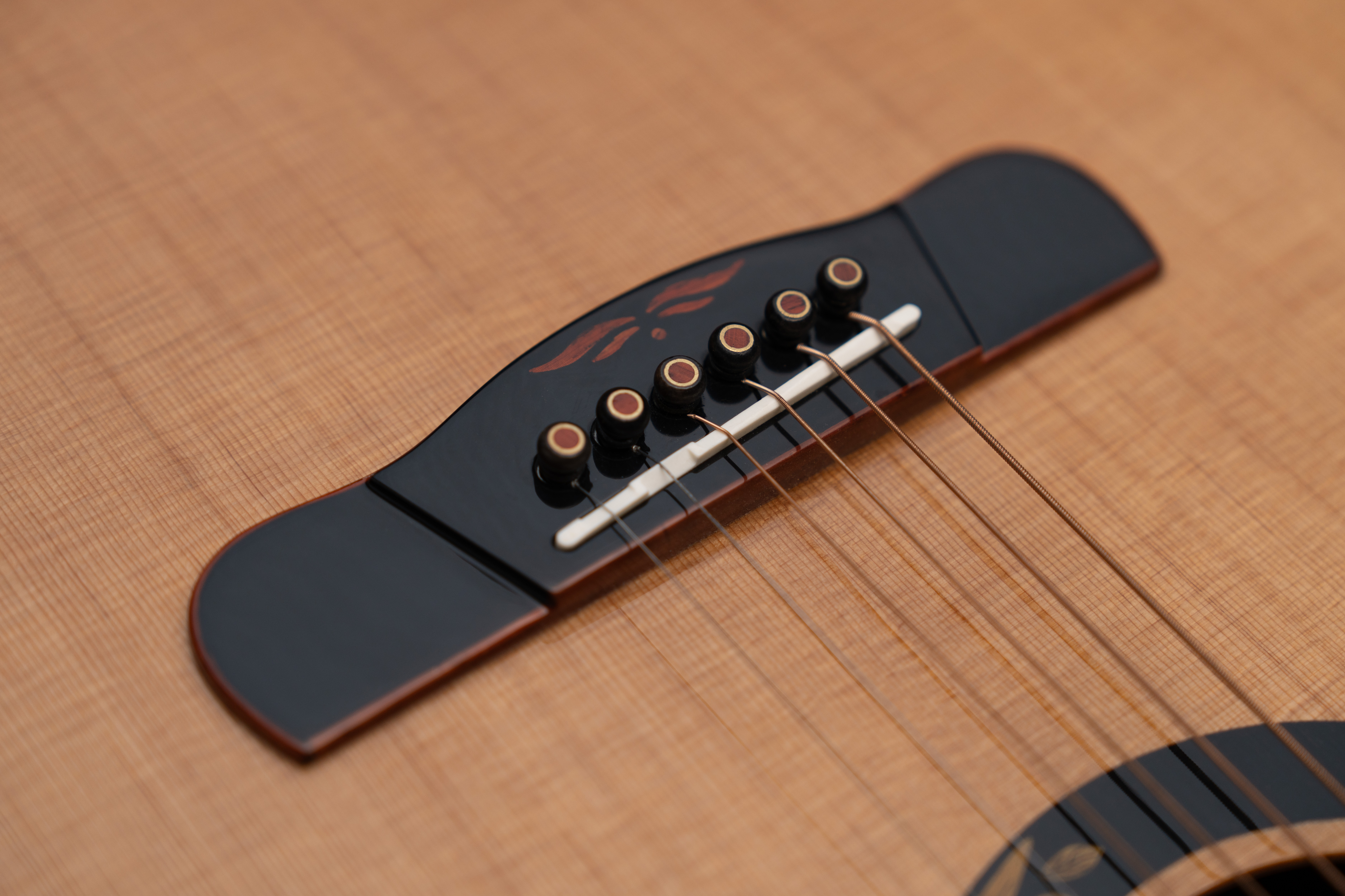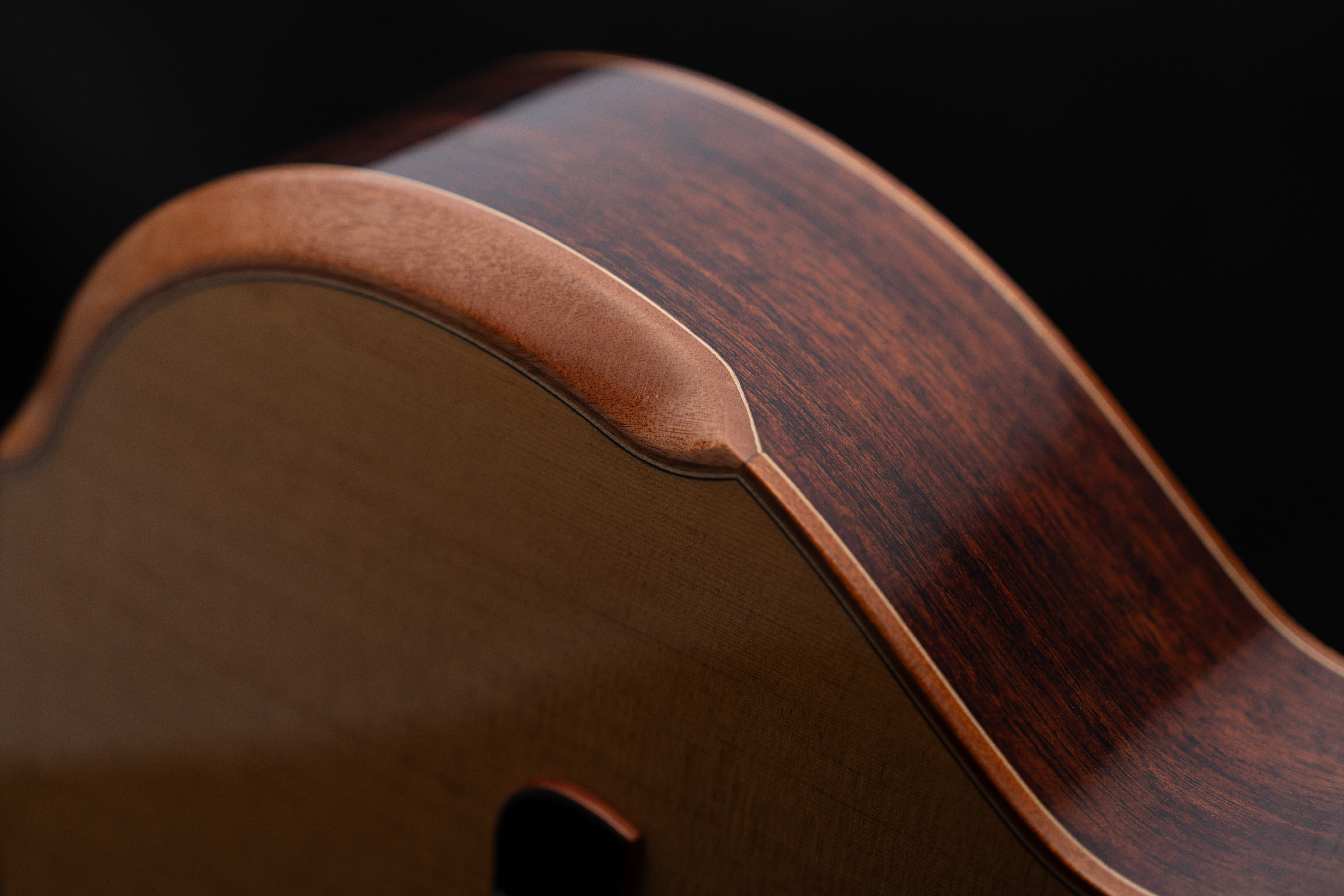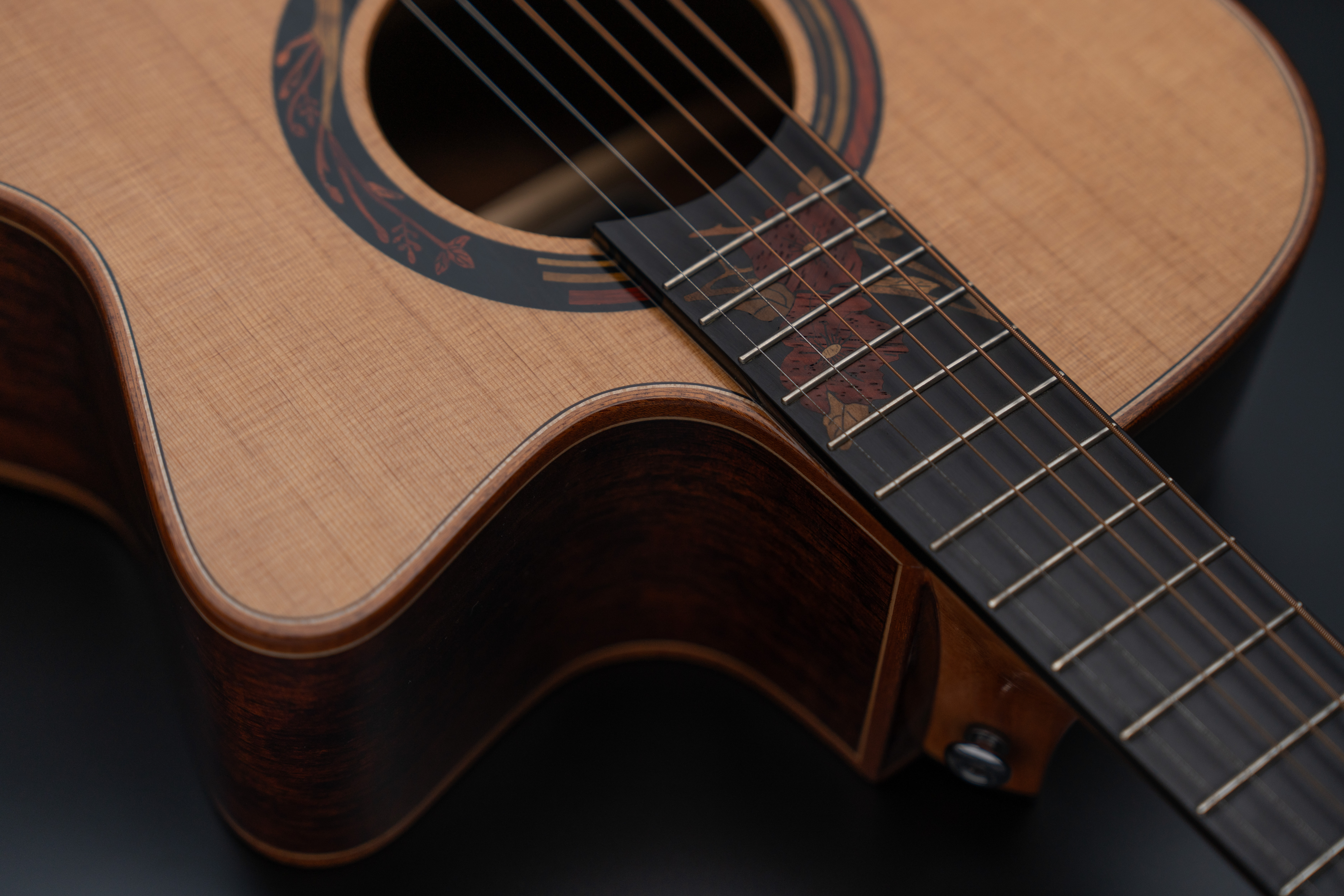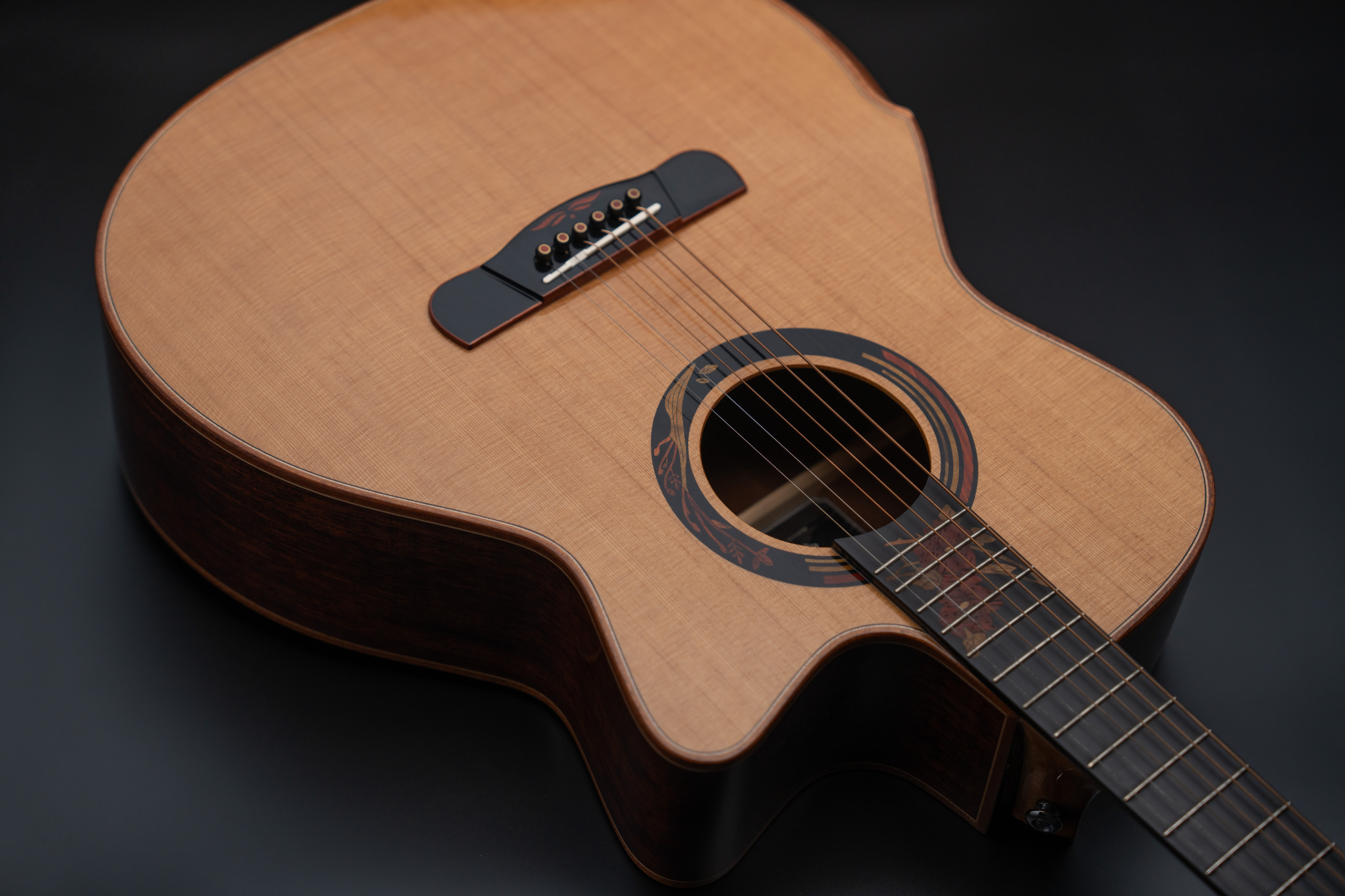 Корпус гитары полностью сделан из отборного массива ААА+ класса, выдерживаемого от 5 лет до нескольких десятилетий. Верхняя дека из кедра, в сочетании с нижней декой и обечайками из африканского махагони, формирует мягкое тёплое звучание.