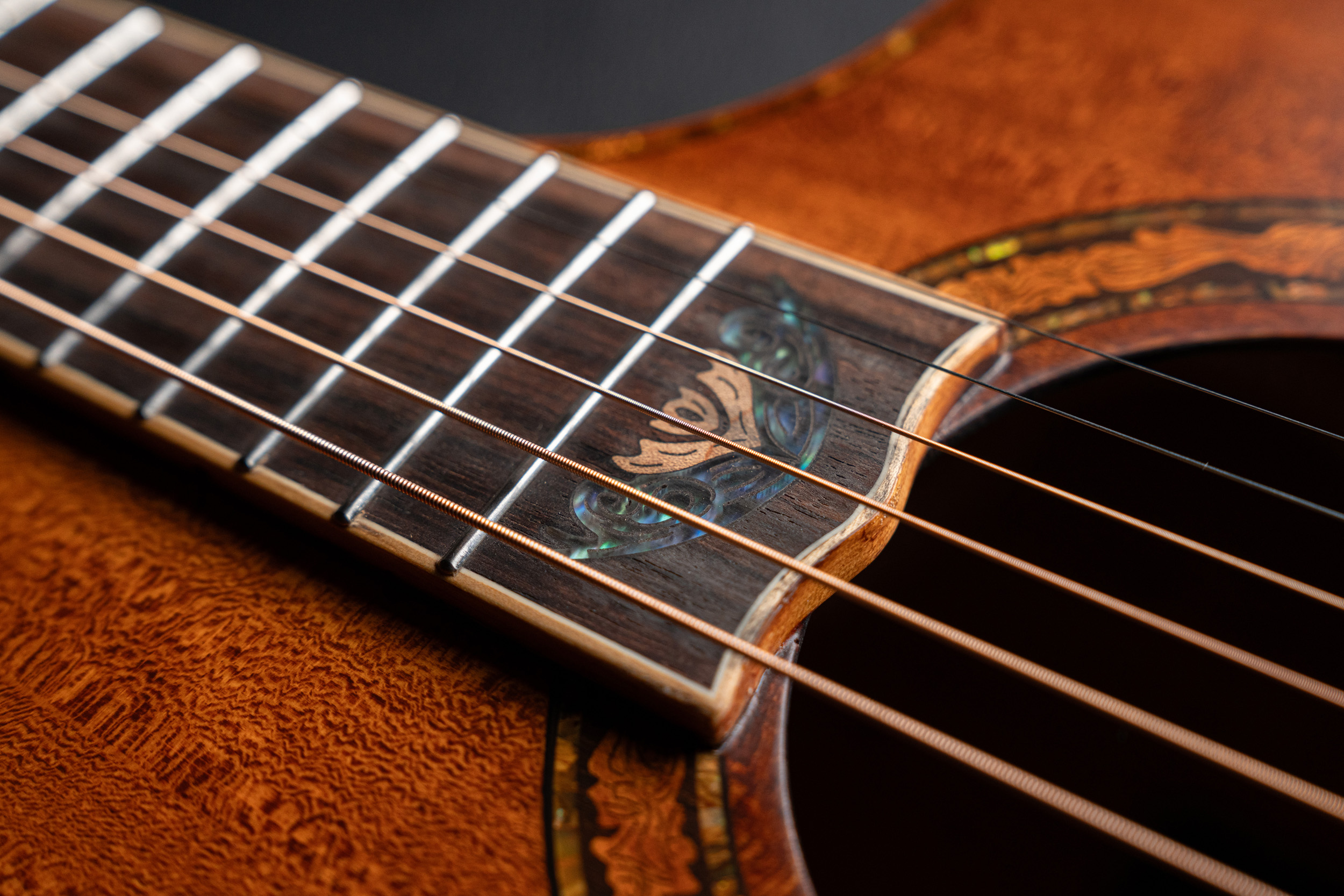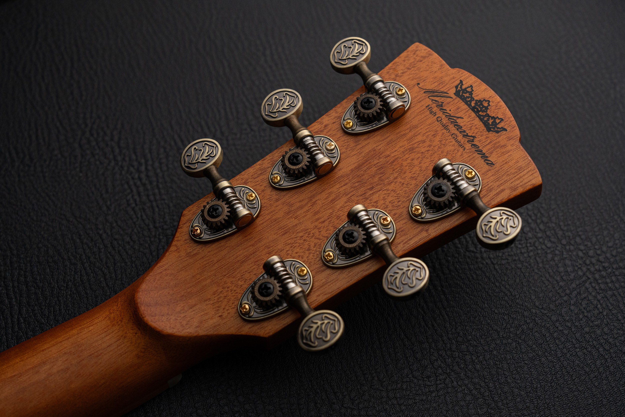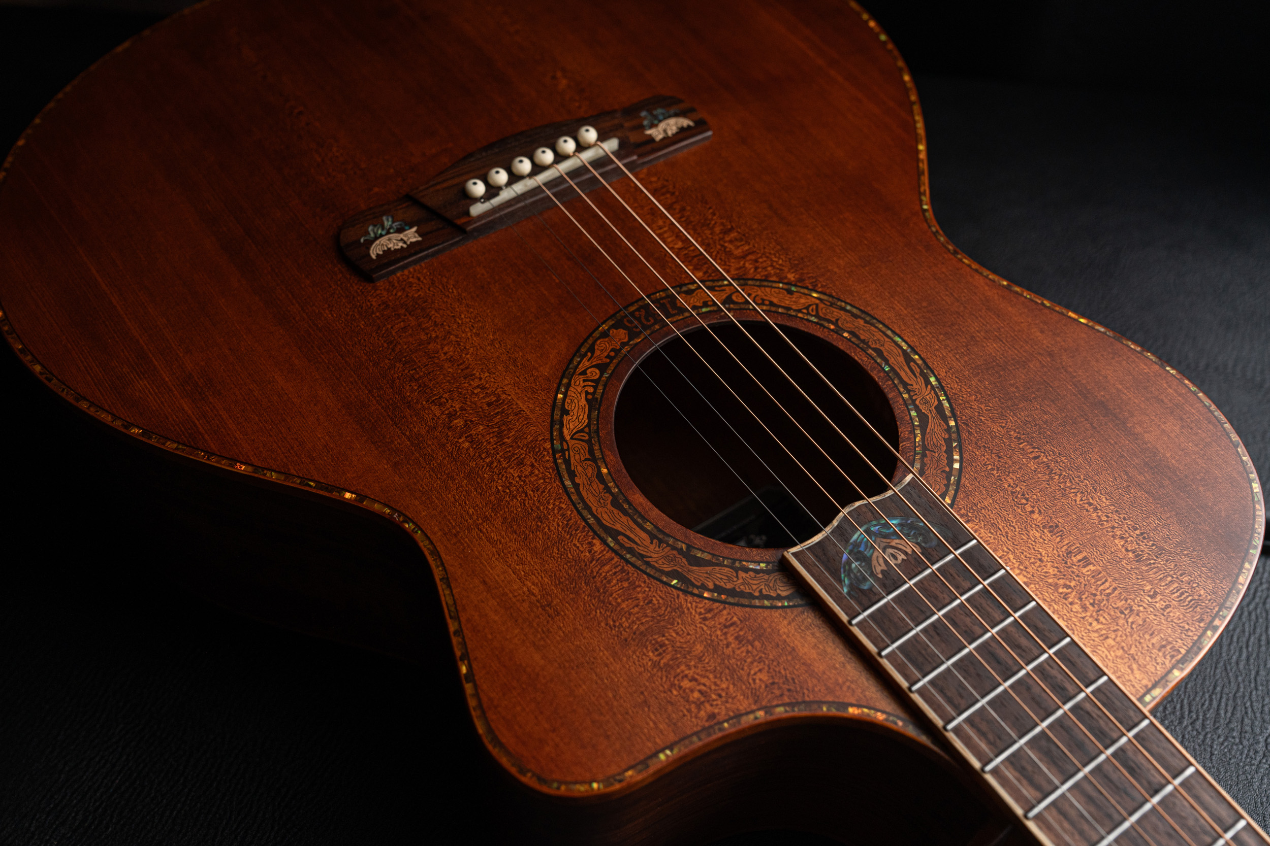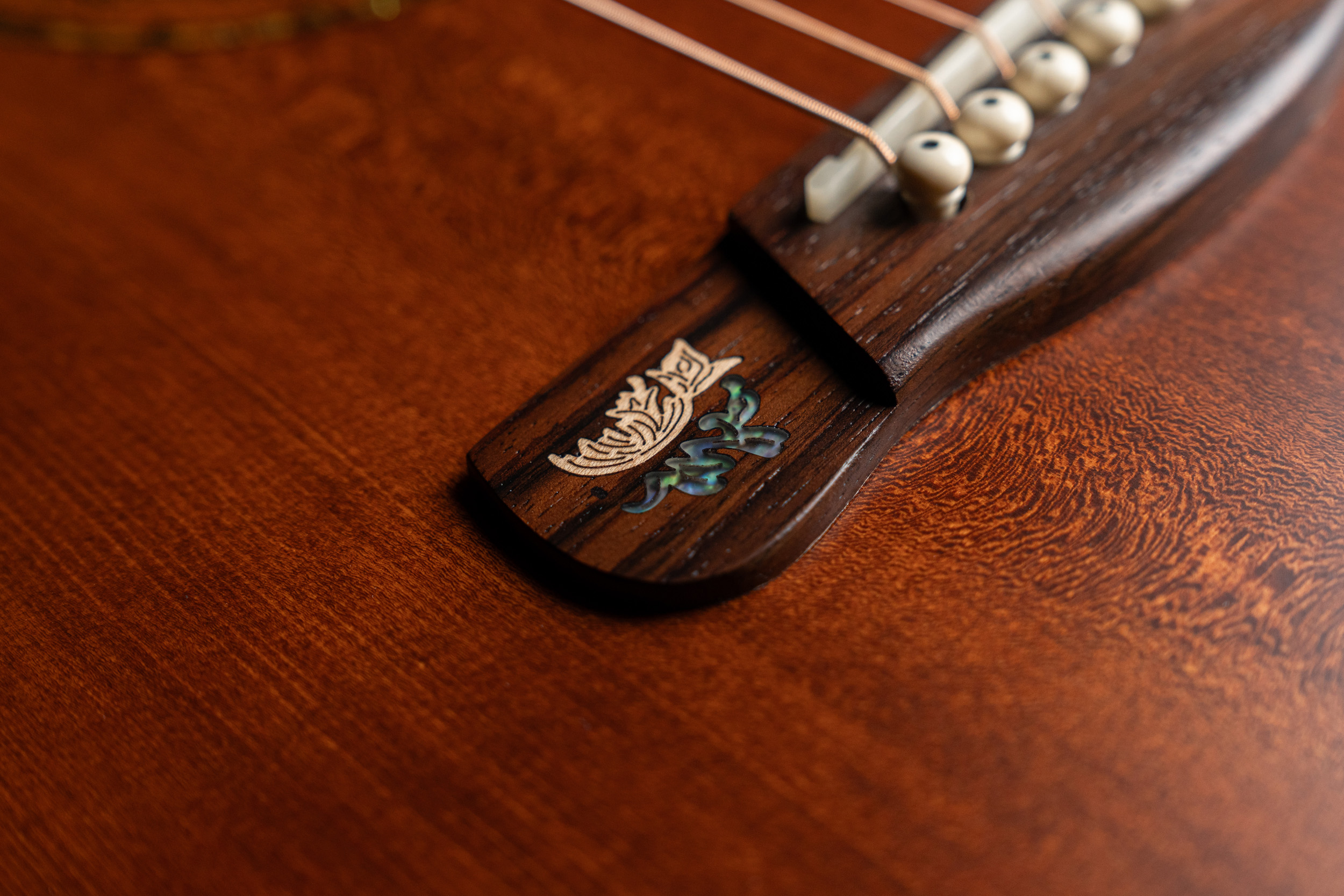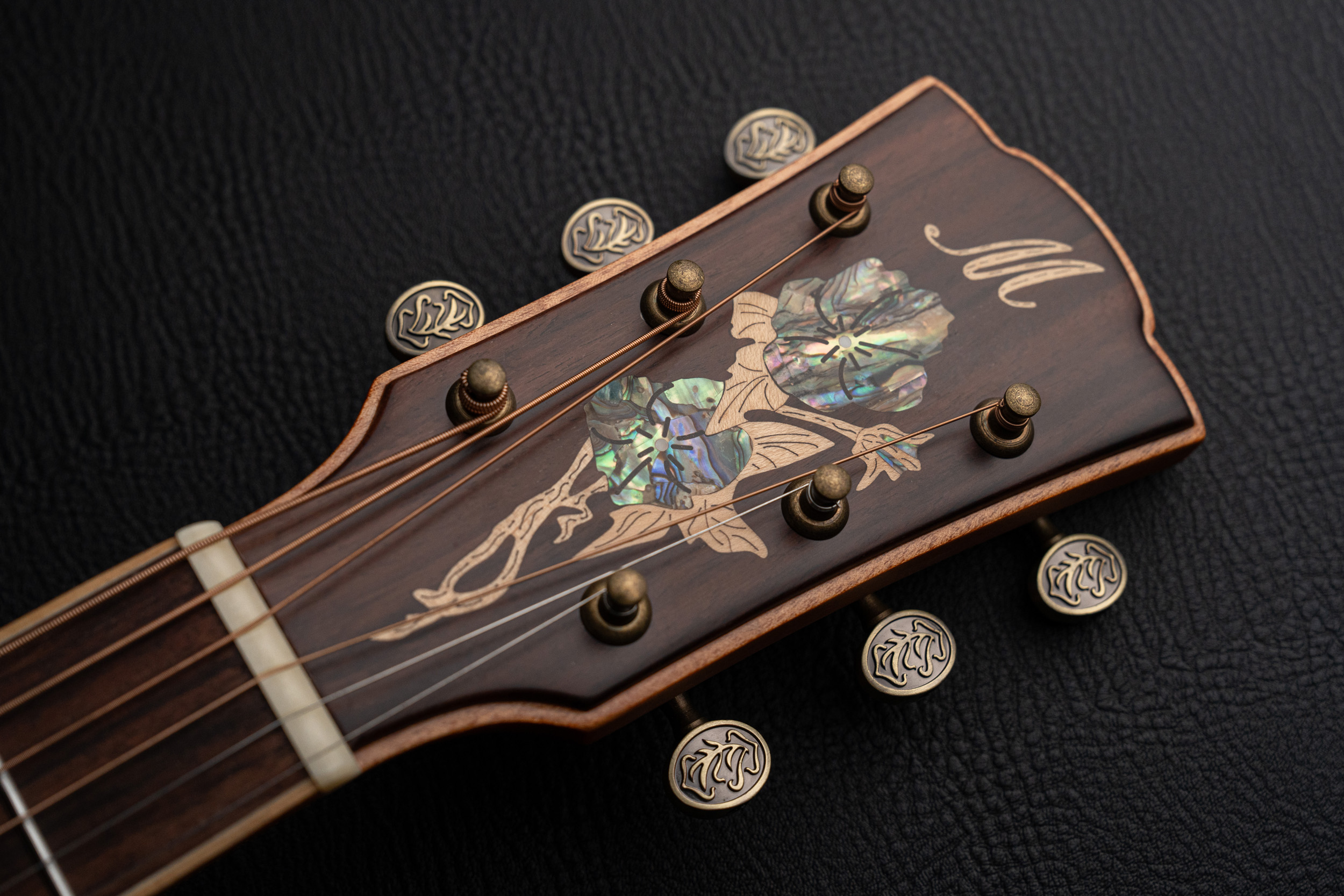 Светлоый древесный дизайн сочетает множество стилистически связных гармоничных полутонов. Бридж, розетка и гриф вручную украшены изумрудно-белыми цветочными узорами из ракушек и благородных пород дерева. Розетка окольцована контрастными окружностями, напоминающими прорезающийся нимб.