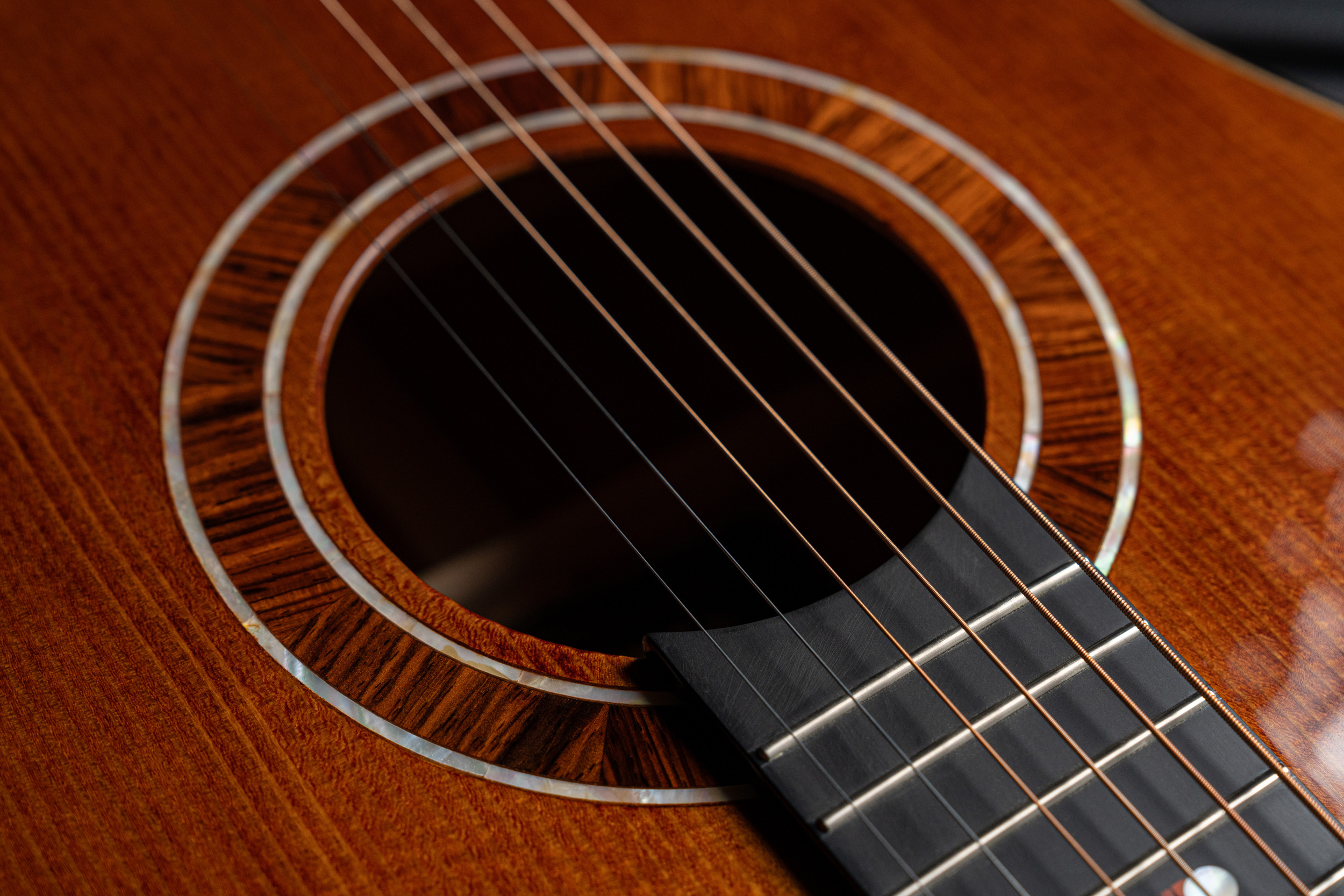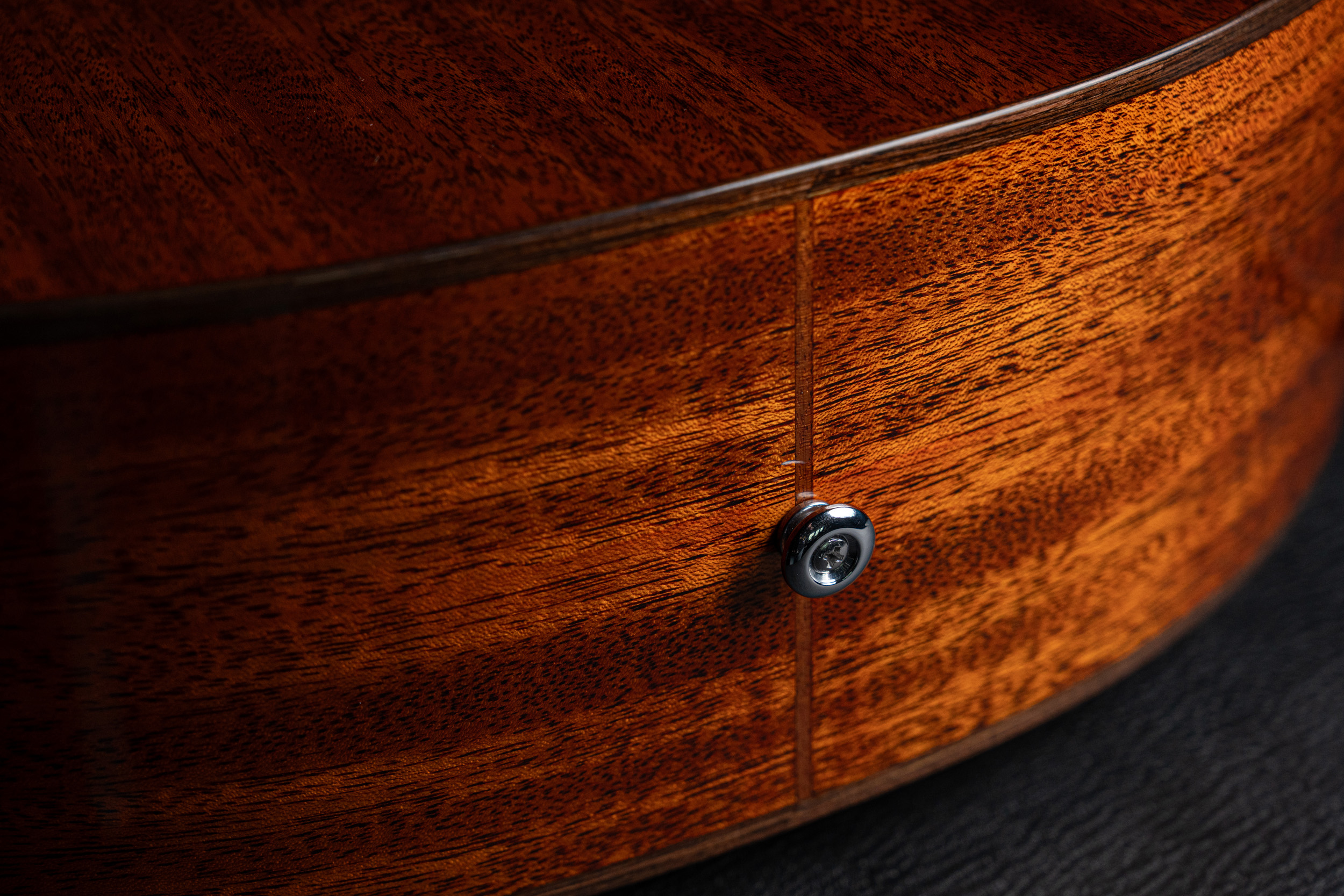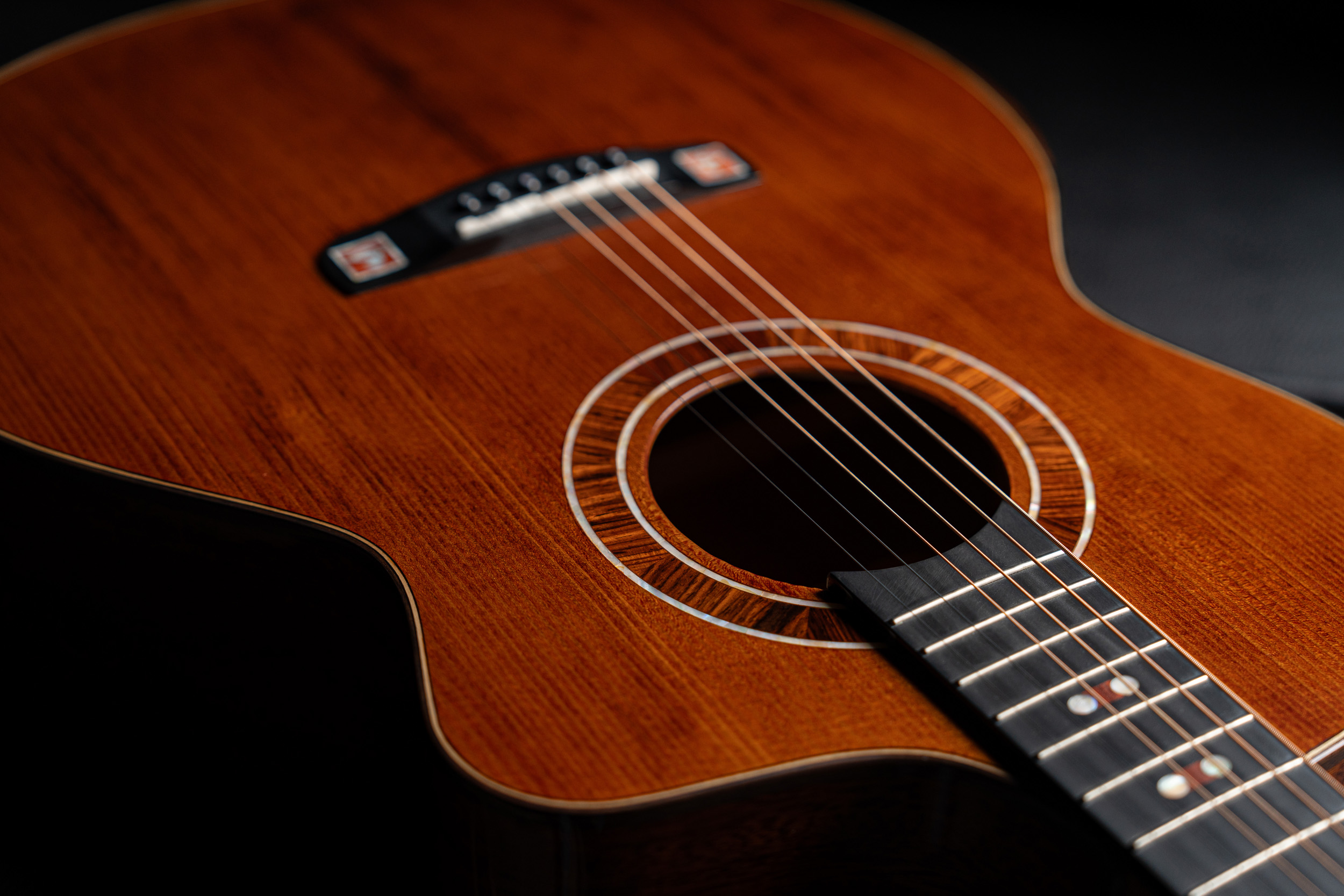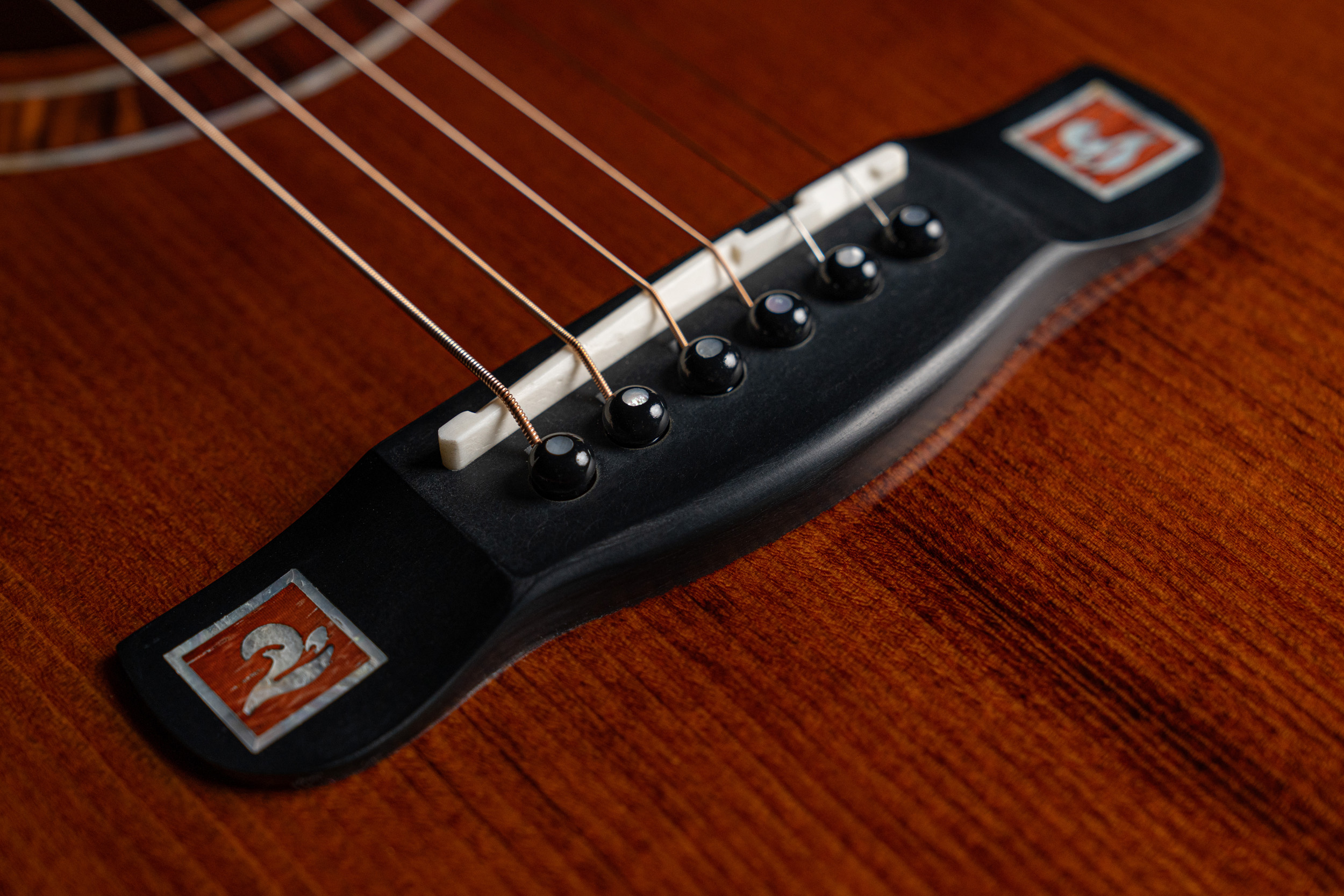 Глянцевый корпус в форме Гранд Аудиториум резонирует объёмно и глубоко. Верхняя дека сделана из обожженной ели, нижняя и обечайка из африканского махагони. В сочетании материалы формируют сильный сбалансированный звук с широким частотным диапазоном.